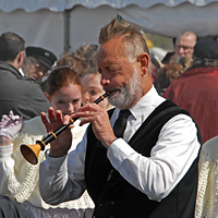 Am nächsten Morgen gehen wir in eine Bäckerei zum Frühstück, zum Kaffee gibt es frische Croissants und andere süße Leckereien. Es ist kalt an diesem Samstagvormittag aber wenigstens scheint die Sonne. In der Touristeninformation erfahren wir vom kostenlosen Shuttelbus nach Loguivy-de-la-mer. Wir laufen am Hafen über einen kleinen Flohmarkt. Eine Malerin verkauft ihre bemerkenswerten Kunstwerke, Ölmalerei auf Treibholz mit Motiven aus dem Fischerdasein. Dann fahren wir mit dem Bus kurze Zeit an der Küste entlang und laufen zum Festplatz rund um den natürlichen Hafen. Auf einem großen Platz sind zwei lange Zelte aufgebaut, dahinter eine Bühne für Musikgruppen. Eine Fokloregruppe spielt und tanzt zur Freude der Zuschauer. Die bretonische Musik ist ausgesprochen lebendig, für uns klingt es ähnlich der irischen Folklore. Es ist Ebbe, die Boote liegen auf Sand. Am Hafen sind Verkaufsstände in einer Zeltreihe aufgebaut, neben den fangfrischen Jakobsmuscheln werden auch andere regionaltypische Produkte wie Meersalz, Salami und Käse oder Wein verkauft. Dieter und Bernd lassen sich die frischen Austern schmecken. Wir bummeln an den Ständen entlang auf der Suche nach einer Möglichkeit, die Jakobsmuschel zu probieren. Unsere Suche bleibt vergeblich und wir gehen zurück. Da bemerken wir lange Menschenschlangen an den Zelteingängen. Hier also kann man nach stundenlangem Anstehen am Spieß gegrillte Jakobsmuscheln essen. Wegen der Kälte verschieben wir dieses Vergnügen auf den nächsten Tag.