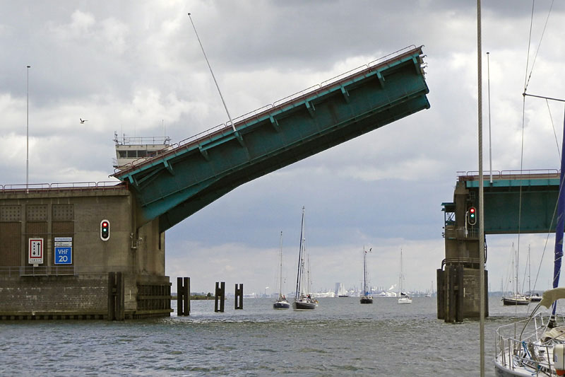 Donnerstag, 19. Juni. Same procedure like yesterday - früh ablegen und rausfahren, Segelsetzen und heute gibt es kein zurück. Wir segeln mit gutem Wind bei diesigen Wetter über die Nordsee zum Hoek van Holland (Maasmond), der Hauptmündungsstelle des Rhein-Maas-Deltas. Hier, am letzten Teilstück der Schifffahrtsroute Rhein-Rotterdam-Nordsee, mündet der Nieuwe Waterweg. Entsprechend viele Frachtschiffe aus aller Herren Länder verkehren hier in kurzen Abständen. Überwacht wird das Ganze vom Vessel Traffic Service (VTS) Maasmond. Bei Querung der Wasserstraße (Maasgeul) ist Sportbooten empfohlen, sich über VHF3 anzumelden. Roy will das für unsere Boote übernehmen. Als wir in die Nähe der Wasserstraße kommen ist die Sicht recht gut und der Verkehr übersichtlich, so daß er darauf verzichtet. Hinterm Hoek van Holland segeln wir entspannter. Wir nehmen Kurs auf den Harlingvlietdamm. Der Damm gehört zu den Niederländischen Deltawerken, einem Schutzsystem gegen Hochwasser und Sturmfluten und ist beeindruckend in seiner Größe und Architektur. Wir passieren die Goereesesluis Stellendam, verlassen die Nordsee und gelangen in das Binnengewässer Haringvliet. Der Haringvliet war eine ehemalige Meeresbucht, die 1970 mit dem Haringvlietdamm von der Nordsee getrennt wurde und jetzt einen Teil des untersten Rheinlaufs bildet. Wir fahren vorbei an Stellendam und legen im Heliushaven Hellevoetsluis an.