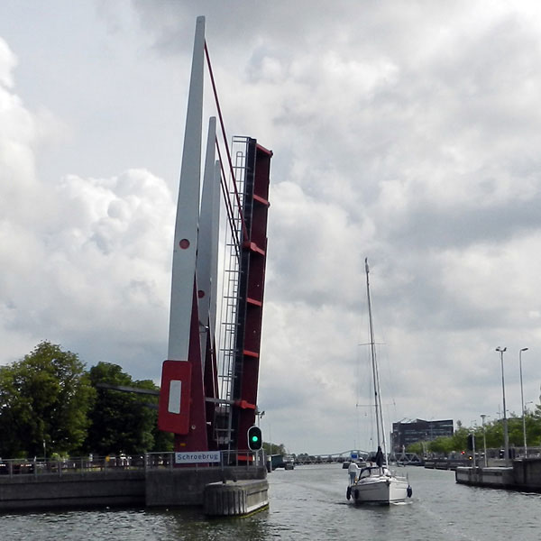 Dienstag 24. Juni. Wir wollen weiter in die Oosterschelde. Am Wartesteg vor der Grevelingen Schleuse passiert es wieder - der Motor der Etanche streikt. Ellis und Roy können nicht weiter und bestellen einen Motor Spezialisten. Wir Entscheiden allein weiter zu fahren und uns nach der Reparatur wieder zu treffen. Nach einem kurzen und traurigen Abschied passieren wir die Schleuse. Wir erleben einen wundervollen Segeltag durch die Osterschelde, den Bug gerichtet auf die gewaltige, 5km lange Zeelandbrücke. Dann fahren wir ein Stück parallel zur Brücke und später nehmen wir Kurs auf die Schleuse Goese Sas. Nach der Schleuse geht es 2,5sm über den Hafenkanal nach Goes. Hinter der Ringbrug liegt der kleine Hafen "WV de Weerf". Der alte Hafenmeister weist uns ein und hilft beim anlegen. In der Innenstadt von Goes besichtigen wir die gotische Maria-Magdalenen-Kirche und das Rathaus. Auf dem belebten Marktplatz essen wir Spareribs und Pasta. Die Spagetti mit Gambas bekommen von Eva das Prädikat "never again".