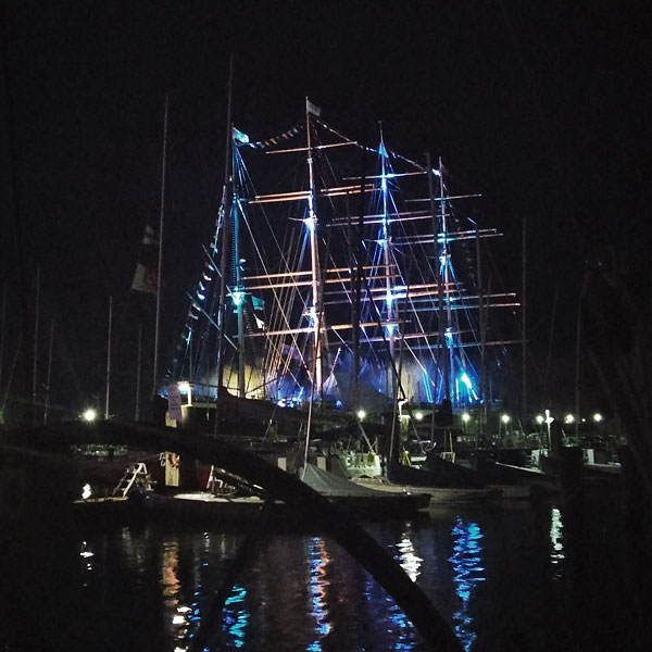 Allabendlich sitzen wir an Bord auf dem Achterdeck mit einem Glas Wein und schauen auf die illuminierte "Passat". Und jeder Tag endet mit