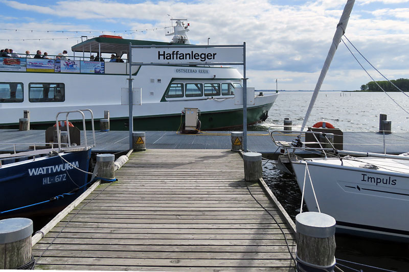 Liegeplatz direkt hinter dem Anleger für Fahrgastschiffe. Die kleine Stadt mit Kurhaus und Residenz, Promenade, Seebrücke und dem hellen
