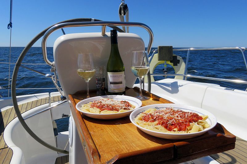 Während das Vorsegel uns langsam durch die Irbenstraße zieht, bereiten wir uns Pasta mit einem würzigen